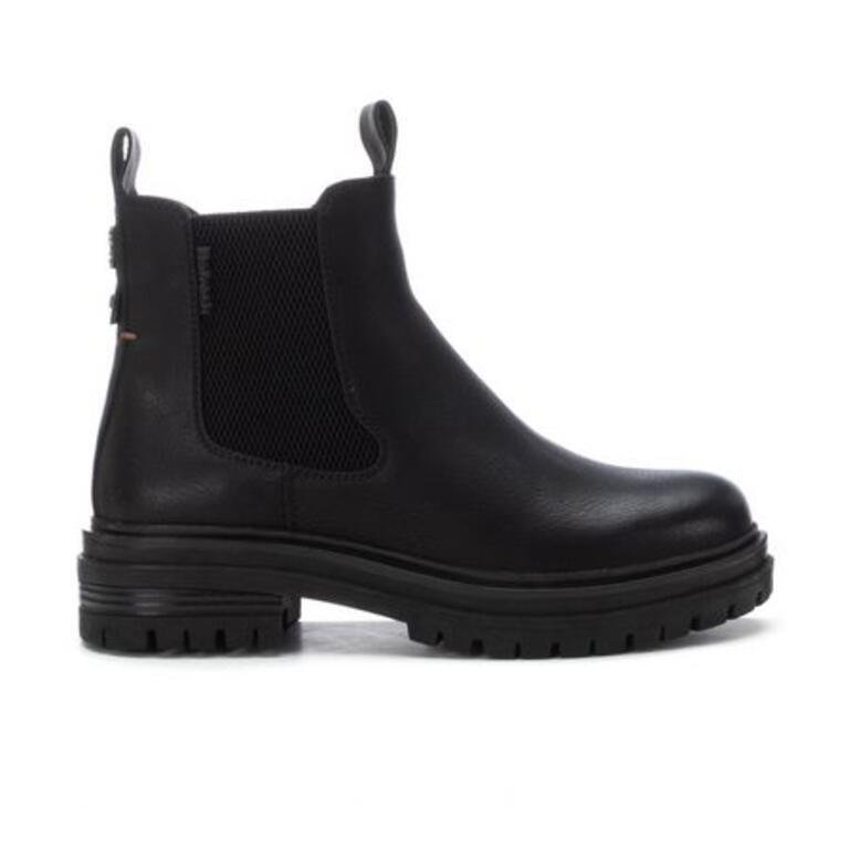 Botín negro con suela plana de goma de color negro, con cierre de cremallera en en un lado y banda elástica en el otro lado. Fabricado en material vegano