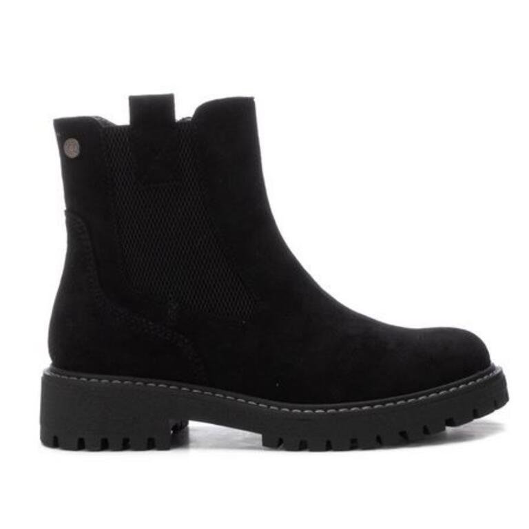 Botín de la marca REFRESH en color negro con suela de goma, cierre de cremallera en un lateral y banda elástica en el otro lado fabricadas en material vegano