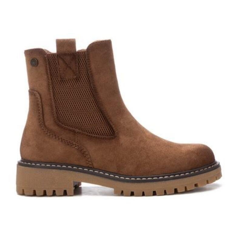 Botín de la marca REFRESH en color marrón con suela de goma, cierre de cremallera en un lateral y banda elástica en el otro lado fabricadas en material vegano