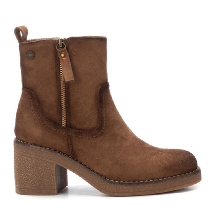 Botín de la marca REFRESH en color camel con suela de goma y tacón, cierre con cremallera lateral y fabricado en material vegano