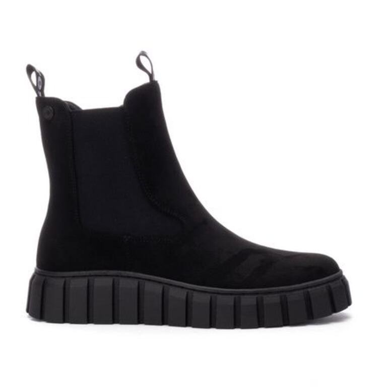Botín negro de la marca REFRESH con suela de goma cierre con cremallera en un lateral y una bnada elástica en el otro lado. fabricadas en material vegano