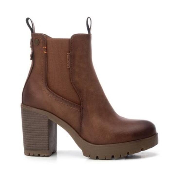 Botín de la marca REFRESH en color camel con tacón y suela de goma, cierre lateral con cremallera y bnada elástica en el otro lateral. fabricado en material vegano