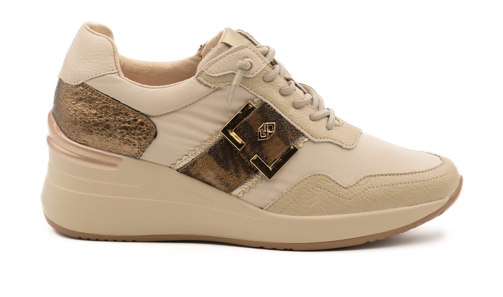 Zapato de mujer estilo deportivo de la marca MYSOFT, en color beige con cierre de cordones elásticos y con cuña